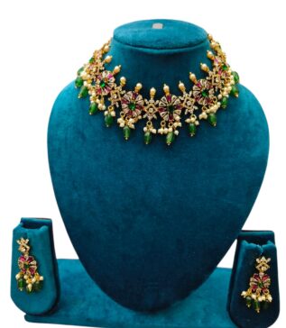 Complete bridal set with choker, long haram, earrings, and maang tikka