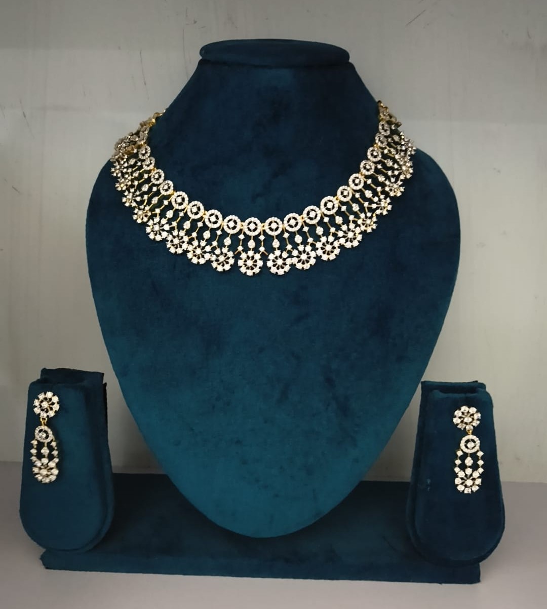 Finished with premium white rhodium plating, the choker offers a luxurious silver-tone shine that resists tarnishing and maintains its brilliance over time. Each stone is carefully set to maximize light reflection, giving the piece a diamond-like sparkle that stands out both in daylight and evening events. The matching drop earrings complement the design perfectly, creating a coordinated and graceful jewelry set.
