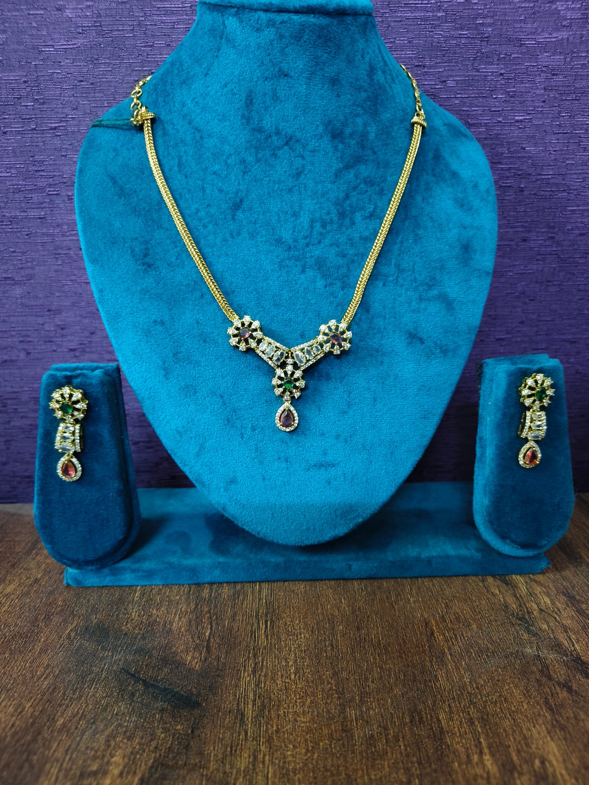 The centerpiece pendant features a delicate arrangement of dazzling stones, highlighted with subtle hints of rich hues that add depth and character to the design. The finely crafted chain enhances the overall appeal, offering both durability and a luxurious finish. Paired with beautifully matching earrings, this set creates a harmonious look that effortlessly enhances your style.
