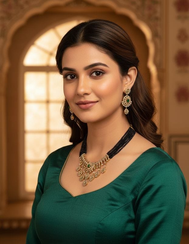 Crafted for durability and long-lasting shine, the Emerald Sparkle Black Beads Necklace Set is a must-have accessory for women who love timeless jewellery with a modern designer finish. It also makes a thoughtful gift choice for birthdays, anniversaries, and festive celebrations.