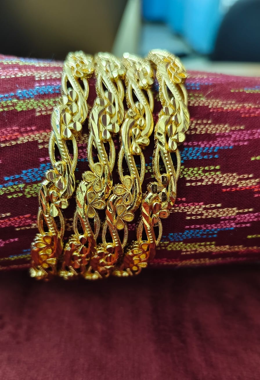 Add a touch of elegance to your traditional look with this beautifully crafted Floral Design Bangle Set. Designed with intricate flower motifs and fine detailing, these bangles offer a graceful blend of classic charm and modern finish. The polished gold-tone surface enhances the richness, making them perfect for festive wear, weddings, and special occasions.