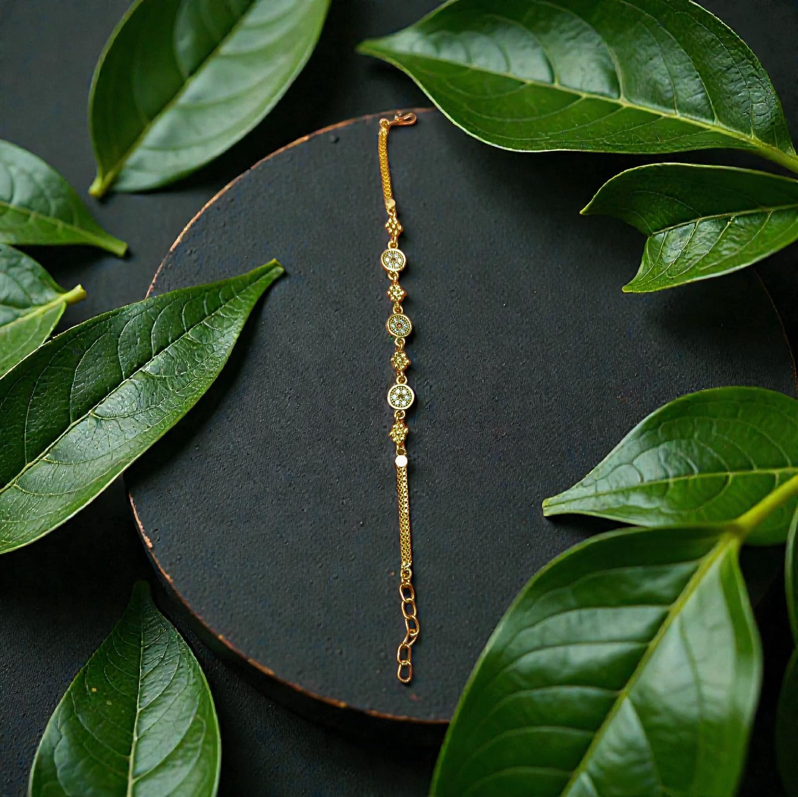 The bracelet is thoughtfully designed to sit comfortably on the wrist, with an adjustable chain that ensures a secure and personalized fit. Each charm is intricately placed to create a balanced, graceful look that enhances its premium aesthetic. Whether paired with traditional attire, modern outfits, or festive ensembles, this piece adds a subtle sparkle and refined finish to your overall look.