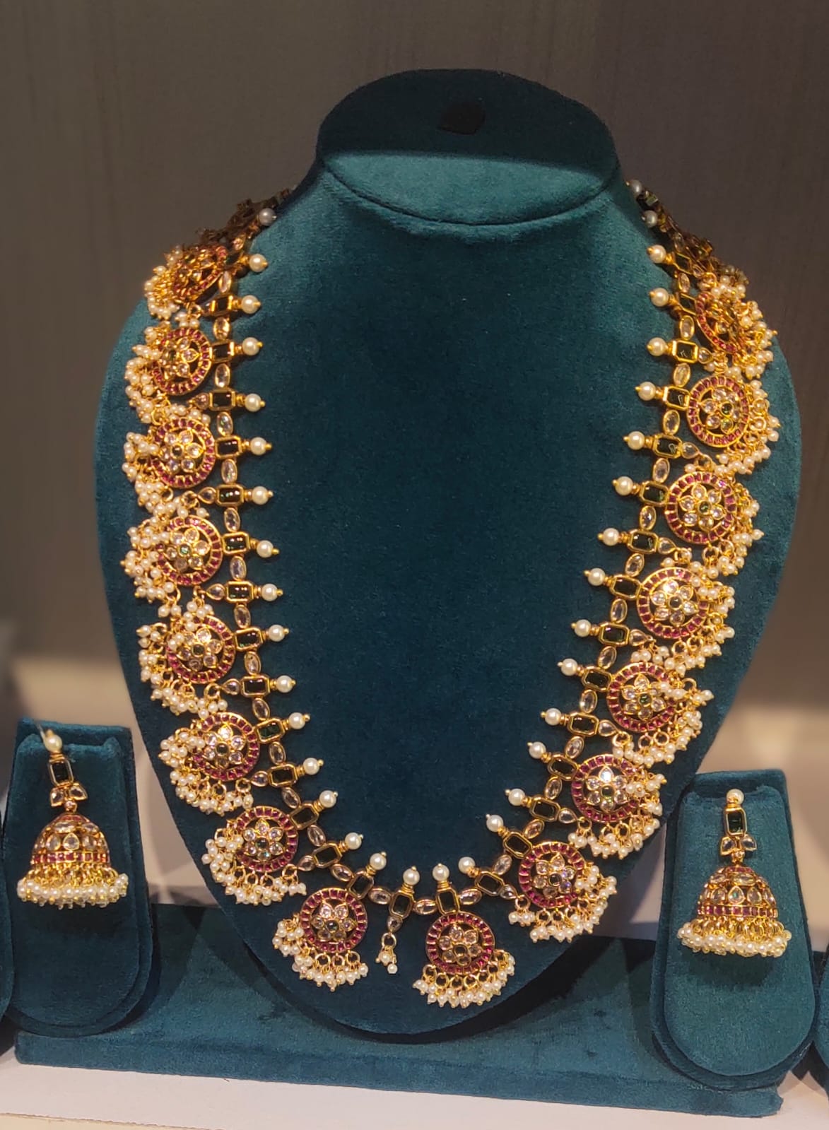 Paired with matching jhumka earrings, this set completes a classic ethnic look effortlessly. Whether styled with a silk saree, lehenga, or traditional attire, this Guttapusalu necklace brings royal charm and heritage beauty to every ensemble, making it a must-have piece for jewellery lovers who appreciate timeless craftsmanship.