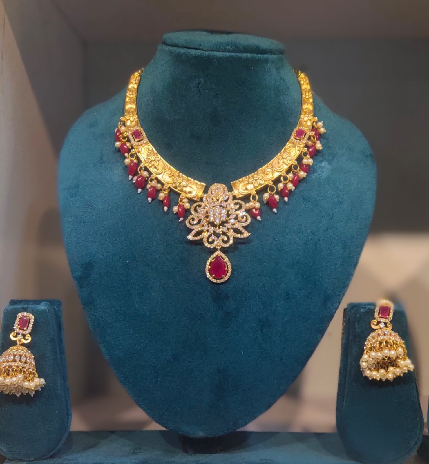 The centerpiece showcases an ornate floral motif embellished with shimmering stones and a striking ruby teardrop pendant, adding depth and grandeur to the overall design. Each element of the necklace reflects fine artistry, making it an ideal choice for weddings, festive occasions, and cultural celebrations.