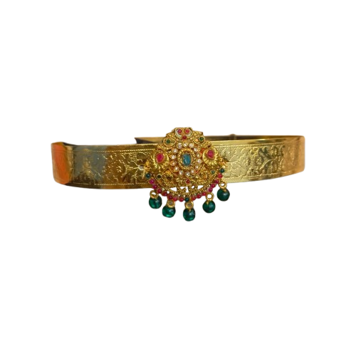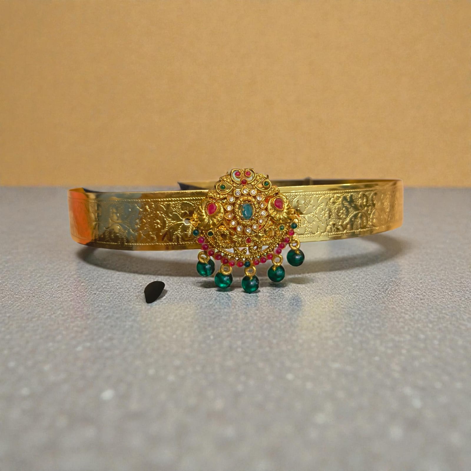 Adding to its charm are the graceful green bead danglers that create a subtle movement and regal finish, making it perfect for bridal wear, festive celebrations, and traditional ceremonies. The structured design ensures a flattering fit around the waist, accentuating your silhouette while keeping the saree pleats perfectly in place.