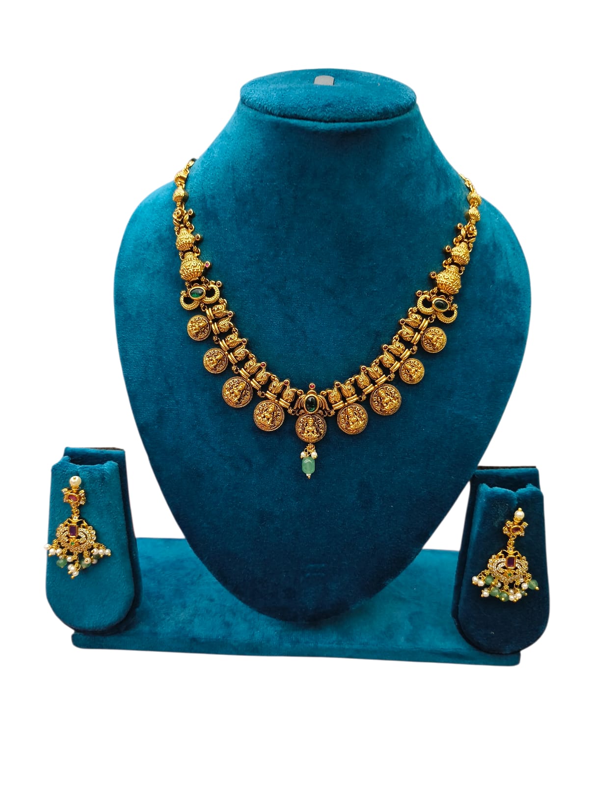 The necklace is adorned with delicate gold beads and subtle green stone accents that add a graceful contrast to the classic gold tone. The symmetrical arrangement of Lakshmi coins creates a majestic look, while the central drop element adds an extra touch of charm and sophistication. Paired with matching traditional jhumka-style earrings, this set completes your festive and bridal look effortlessly.