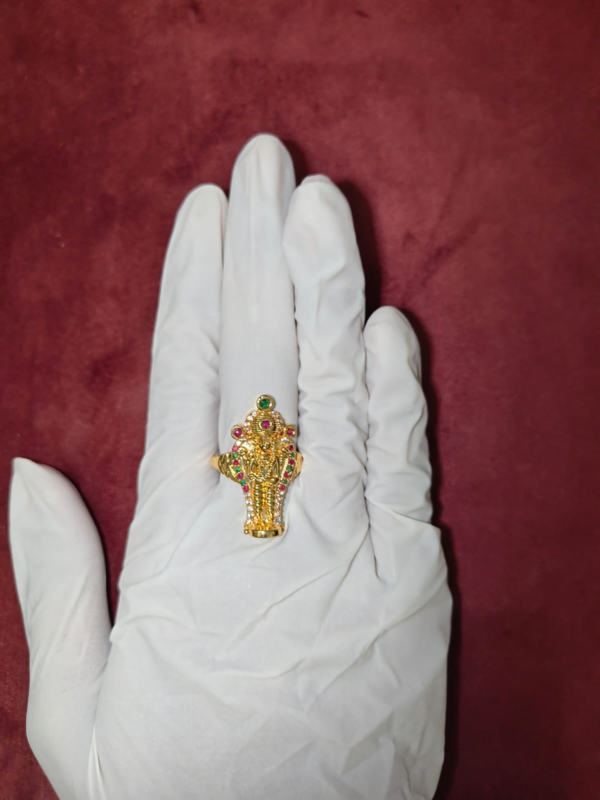 Accented with vibrant traditional stones and a rich antique gold finish, the ring carries the essence of South Indian temple artistry. Its bold yet elegant structure makes it a standout statement piece, perfect for religious occasions, festive wear, or daily devotion. The design blends spirituality with craftsmanship, making it not just an ornament but a meaningful expression of faith.