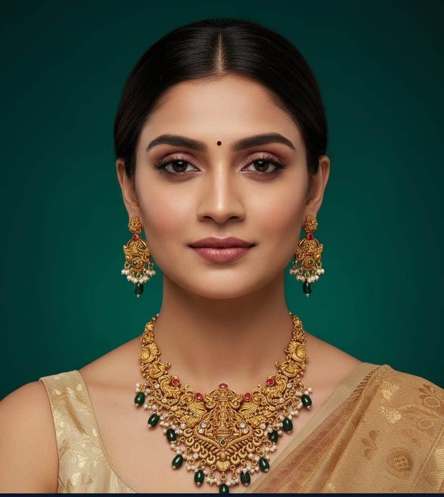 The necklace sits gracefully on the neckline, creating a bold yet elegant silhouette that pairs beautifully with silk sarees, bridal lehengas, and festive attire. Its timeless design makes it not only a bridal essential but also a versatile heirloom piece suitable for religious ceremonies, traditional celebrations, and special family occasions.
