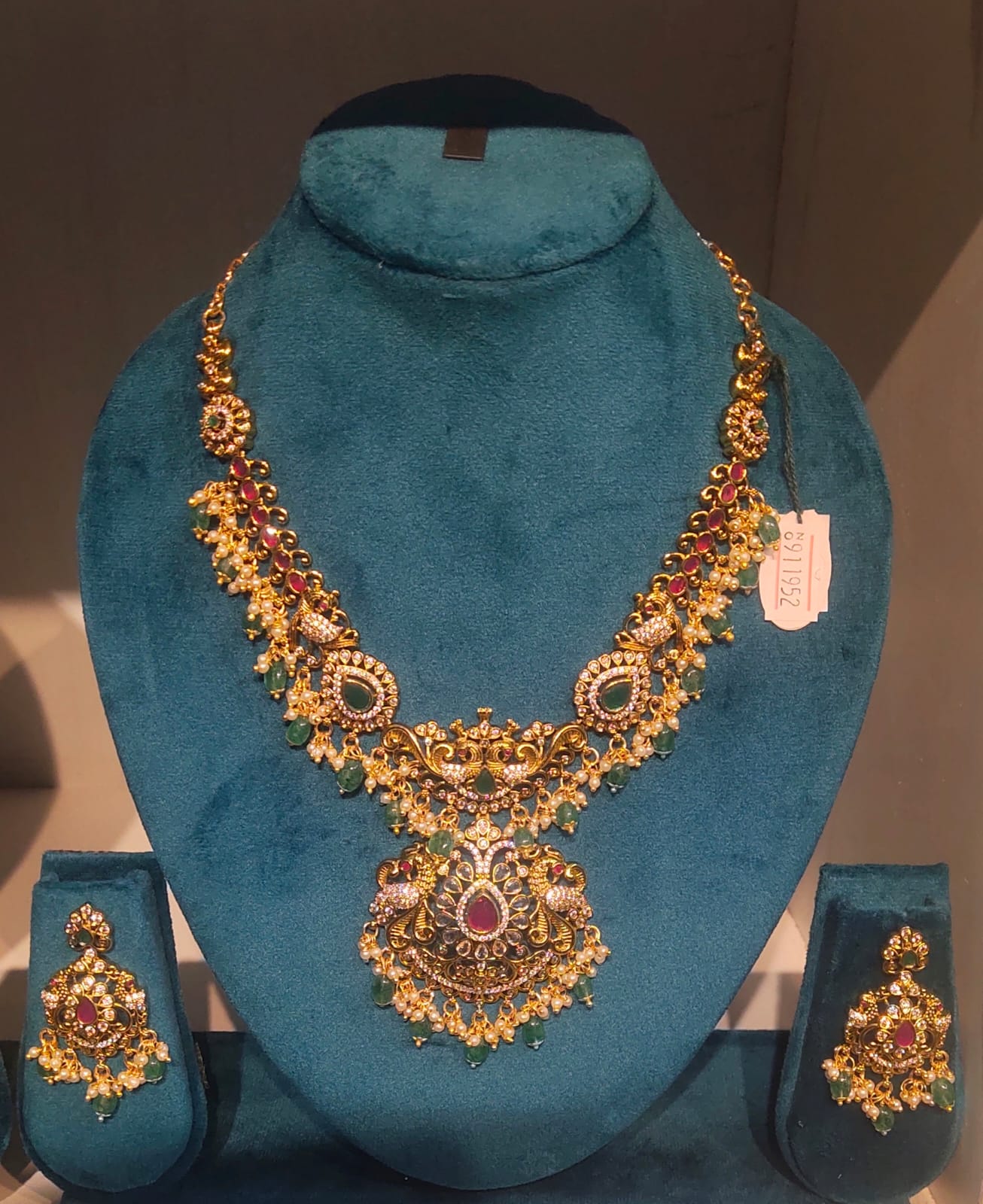 Elevate your traditional look with this exquisite Micro Gold Polishing Necklace, crafted to bring a rich temple-style elegance to every occasion. Designed with intricate detailing, this statement piece features beautifully arranged ruby-tone and emerald-tone stones, fine micro-polish finishing, and delicate pearl drops that enhance its luxurious appeal. The grand central pendant with traditional motifs adds a regal touch, making it perfect for weddings, festive celebrations, and special events.