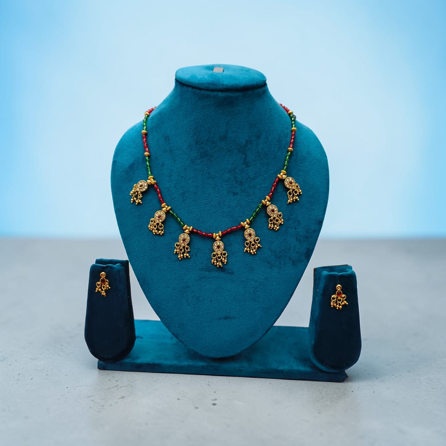 Perfect for weddings, festive celebrations, and cultural events, this necklace set effortlessly complements sarees, lehengas, and even fusion outfits. The matching earrings complete the look, adding a touch of coordinated elegance.