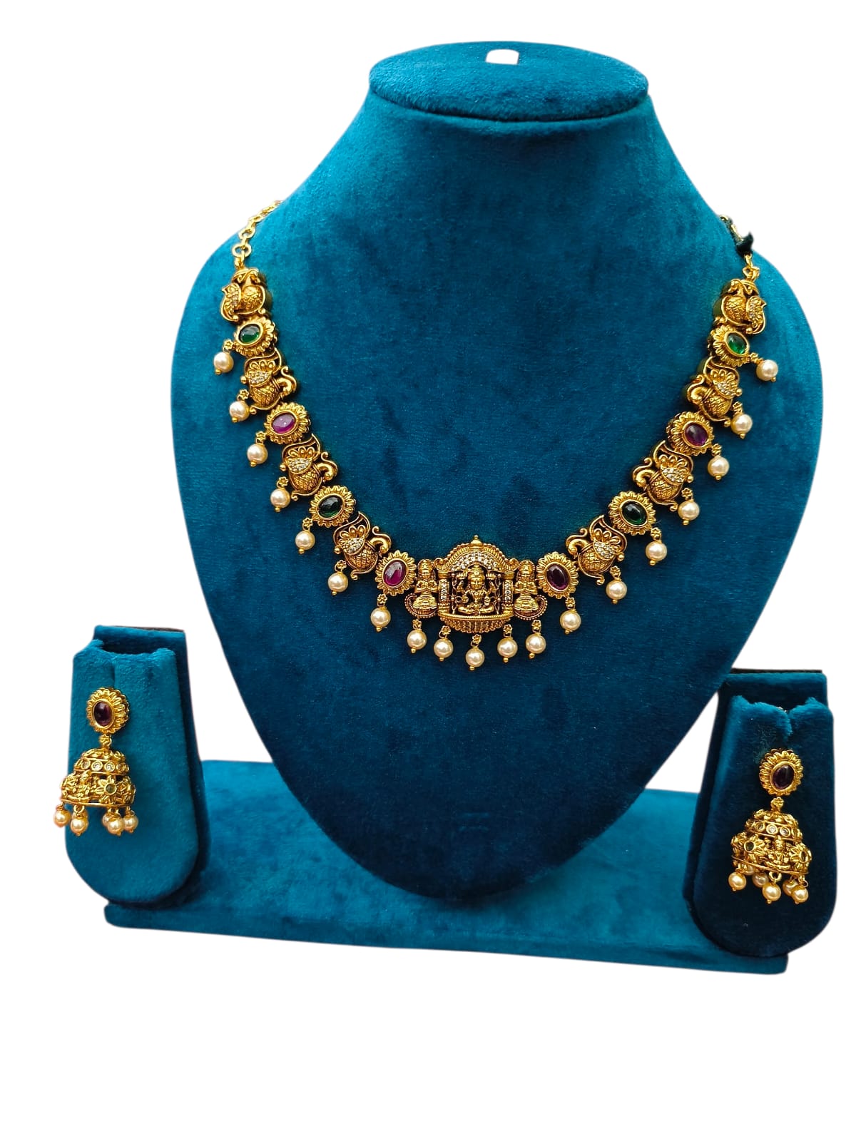 The necklace features alternating ruby, emerald, and deep-toned stones that add a rich pop of color against the antique gold finish. At the center, a beautifully detailed Lakshmi motif pendant enhances its traditional appeal, radiating divine charm and cultural significance. The delicate pearl drops hanging along the necklace add graceful movement and a touch of sophistication.