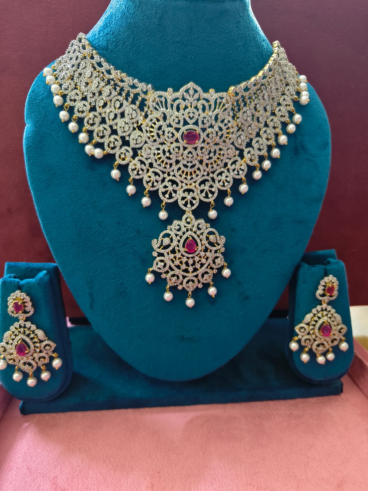 The necklace features a wide, lace-inspired silhouette adorned with delicate detailing and graceful pearl drops that enhance its royal appeal. The rich ruby accents add a bold touch of color, symbolizing prosperity and celebration, while the ornate craftsmanship reflects heritage artistry blended with modern sophistication. The matching earrings complement the choker perfectly, completing a majestic ensemble suitable for weddings, receptions, and special occasions.