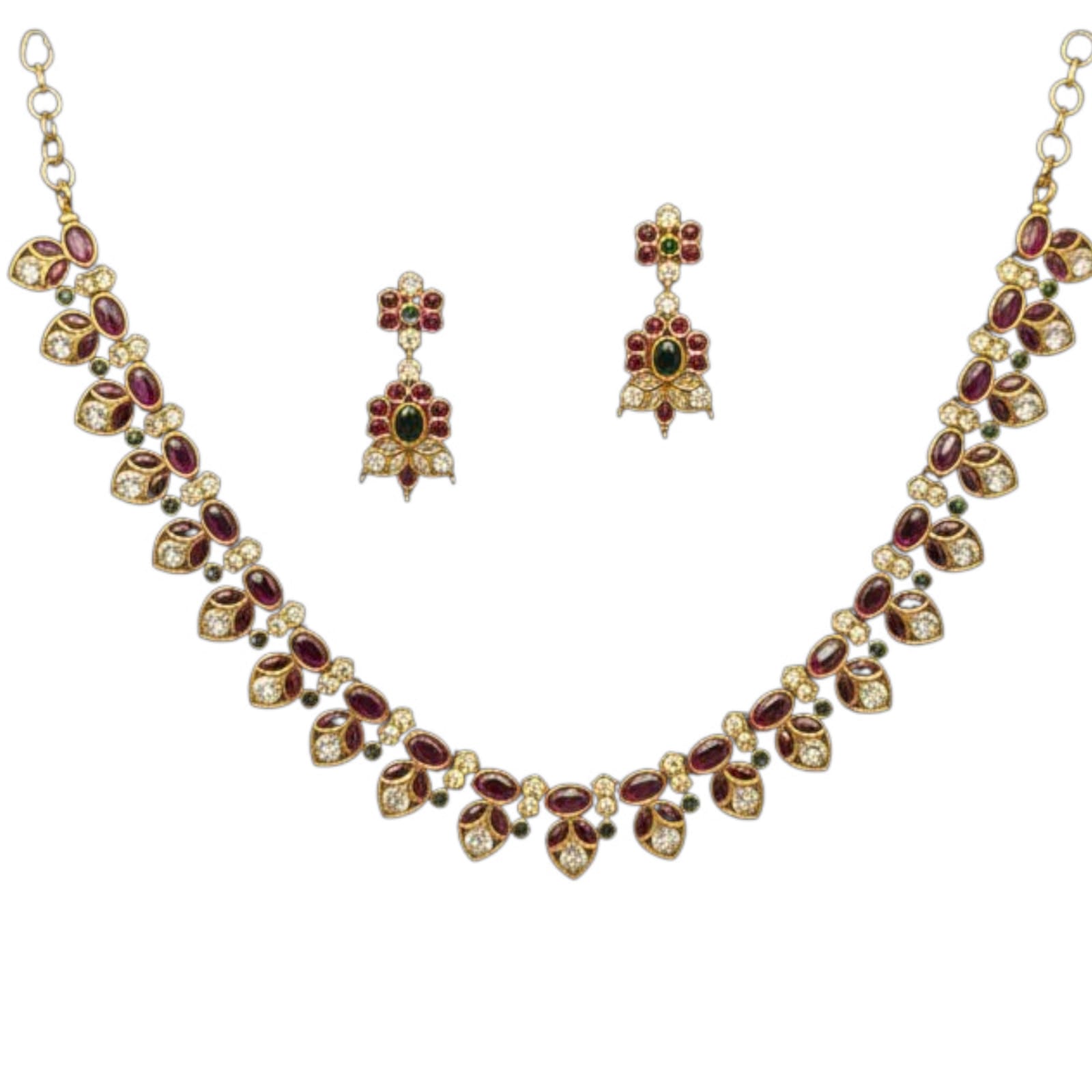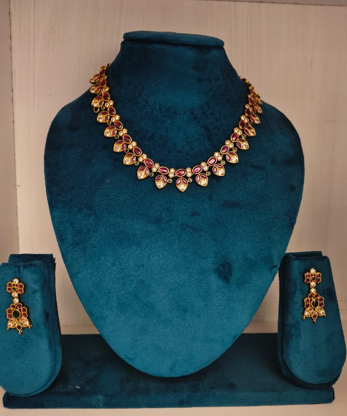 The necklace sits gracefully along the neckline, offering a refined yet statement-worthy look. Accompanied by matching earrings, this set brings a harmonious blend of tradition and contemporary elegance, ideal for bridal wear, festive ensembles, and cultural events.