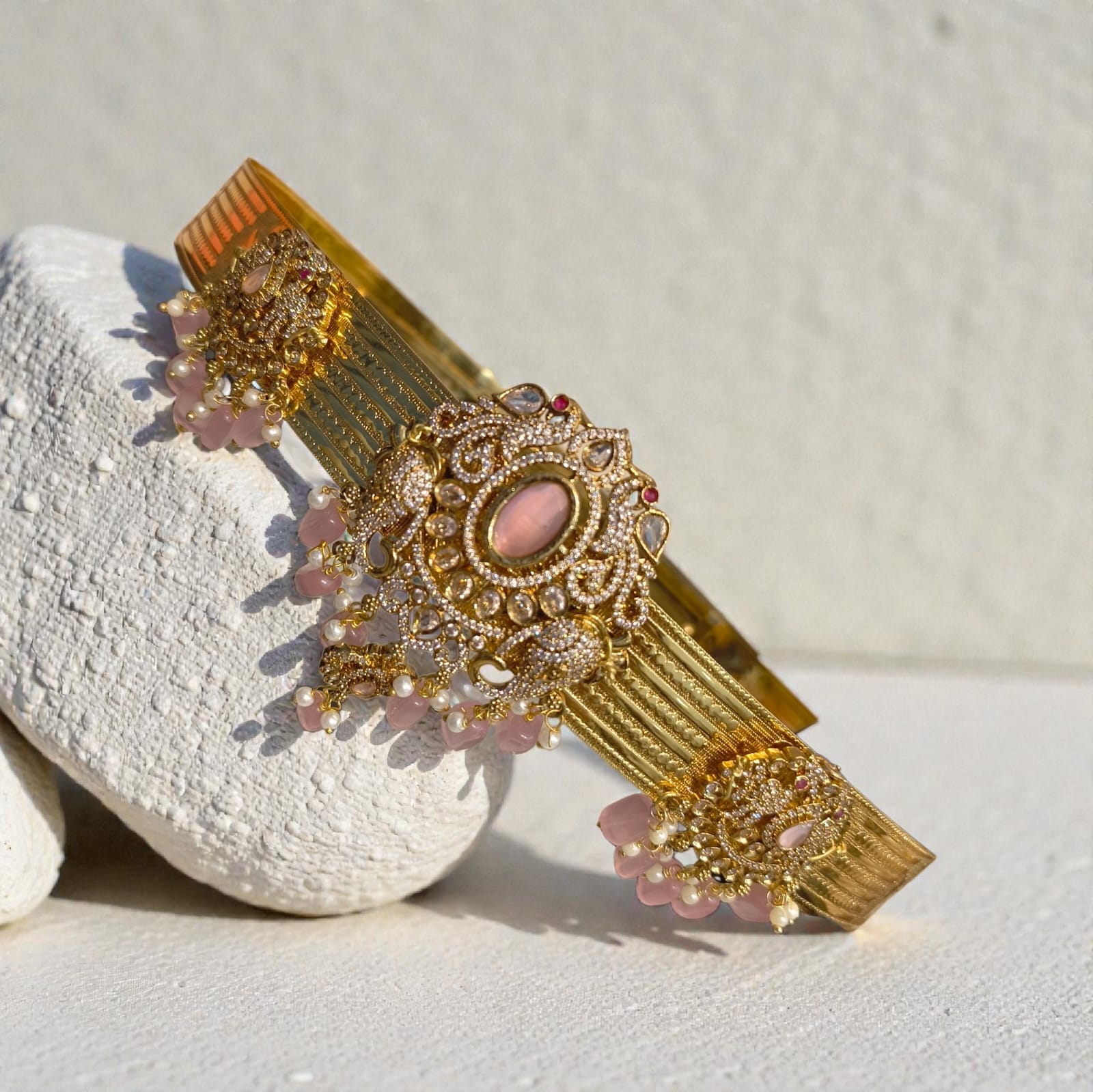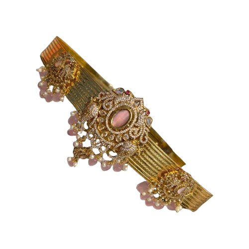 The centerpiece features an elegant oval stone setting surrounded by finely embedded American diamonds that sparkle with every movement. The layered gold-tone finish adds a luxurious appeal, while the delicate pink bead danglers create a soft, feminine touch. The symmetrical side motifs perfectly balance the grand central design, making it ideal for weddings, festive occasions, classical dance performances, and special celebrations.