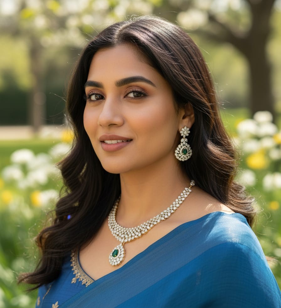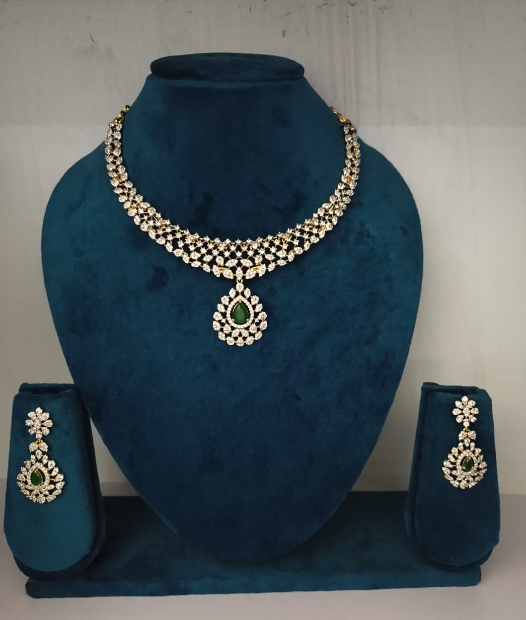 Expertly crafted with premium-quality materials and superior finishing, this necklace offers a rich, polished look that closely resembles fine diamond jewelry. The elegant silhouette rests beautifully on the neckline, enhancing sarees, lehengas, and anarkalis with effortless grandeur. Whether worn for weddings, festive celebrations, receptions, or special occasions, it elevates your ensemble with a royal glow.